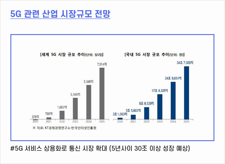 최근에 모바일산업이 많이 커지고 있는데 특히나 거기서 더 찾아볼 것이 5G 관련 산업입니다. 앞으로의 전망을 보면 5G서비스 상용화로 통신시장은 점점 더 거대해지고 있으며 이에 따른 부가산업들이 점차적으로 딸려오는 것은 필연적인 일이니까요.