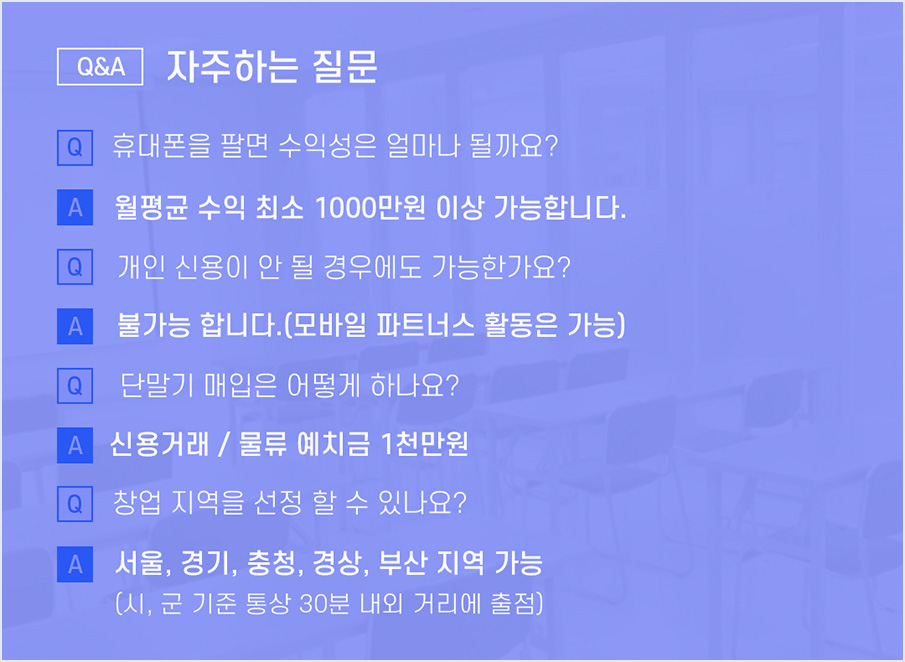 자격만 맞추고 내가 배우고자 하는 열정만 있다면 모바일 아카데미를 그런 분들을 위한 지원을 아끼지 않을것이고 창업아이템추천도 받으면서 휴대폰 창업의 전문가로 우뚝서보시길 바라겠습니다.
