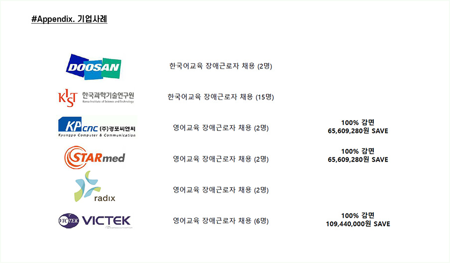 원하시는 고용률로 계약을 진행한다면 장애인 교원의 이탈시, 바로 새로운 교원으로 인력을 충원하여 근로자수를 유지해드리는 것을 보장하고 있습니다. 뿐만 아니라 비대면 어학강사로 채용하는 것이니 만큼 강사로서의 전문성을 강화하기 위한 각종 모델링 수업과 전문적인 교재의 사용등으로 많은 기업에서 만족하고 진행하십니다.