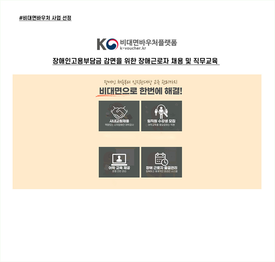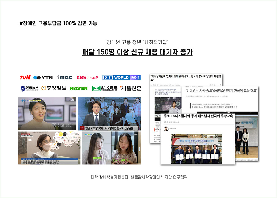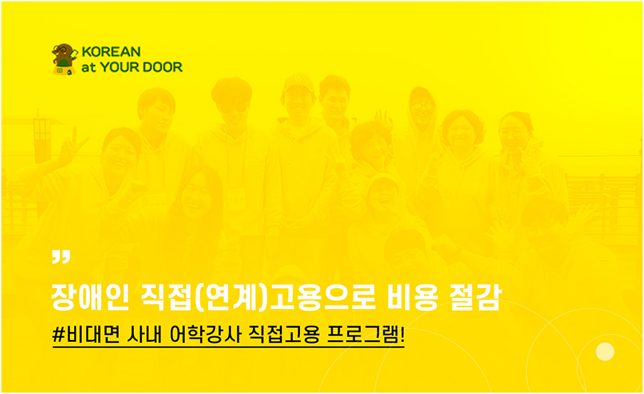 장애인 고용에 따른 혜택과 부담 감소, 사내 복지 향상, 기업의 이미지 향상 등 대면하지 않고도 한꺼번에 해결가능한 장애인 어학 강사 채용. 정부의 비대면 바우처 사업으로 선정도 된 만큼 믿고 의뢰해보시길 바랍니다.