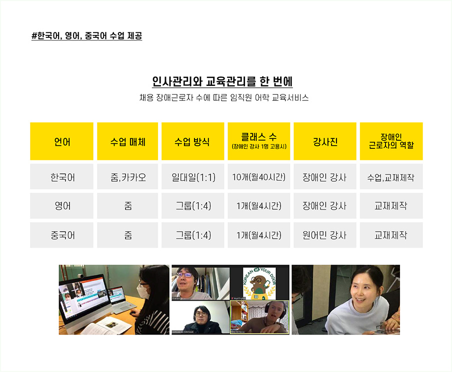 인사관리 뿐 아니라 교육에 대한 관리도 함께 진행해드리고 있는데, 채용하시는 장애근로자 수와 기업의 니즈에 따라 어학교육서비스의 방식과 클래스 수를 다르게 들어가고 있습니다. 그렇기에 원하시는 방향에 맞춘 사내교육을 진행하실 수 있죠.