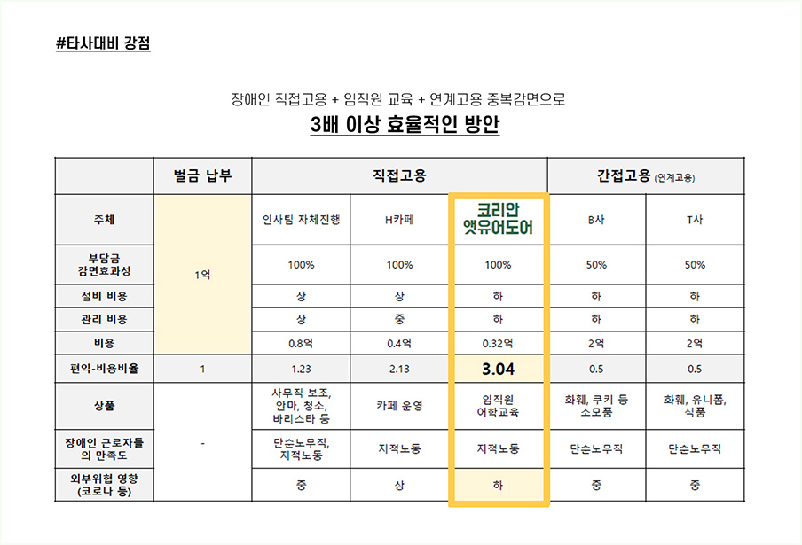 장애인 직접고용에 따른 부담금 감소와 임직원에 대한 사내교육 진행, 연계고용에 따른 중복감면으로 인해 기존에 그냥 방치하고 계시던 때보다 3배 이상으로 효율적인 방향으로 기업을 운영해 가실 수 있습니다.