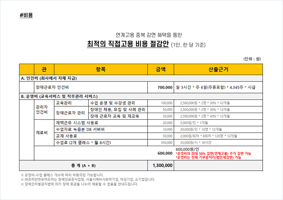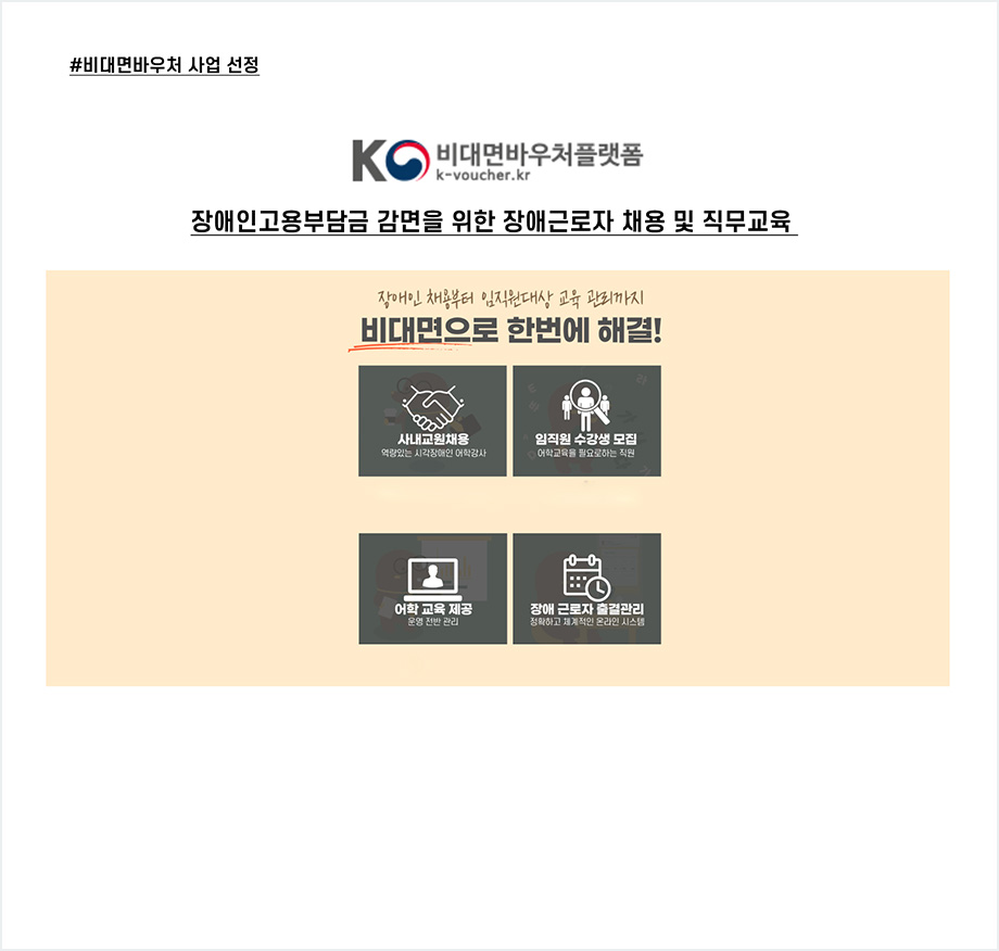 그래서 장애인채용부터 임직원 대상 어학 교육 관리, 장애인 고용부담금 감면까지 한 번에 해결할 수 있으니 장애인 의무 고용에 대한 어려움을 겪고 계시는 분들이라면 케이드를 통해 함께 알아보시는 것도 빠른 방법입니다.