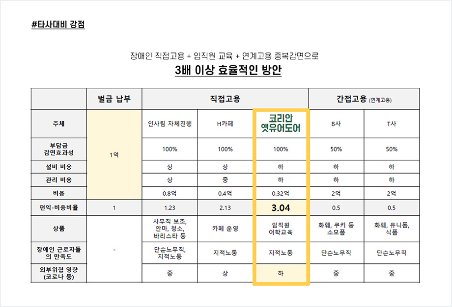 케이드는 장애인채용하는 사회적 기업이자 장애인 표준사업장입니다. 기업 내 장애인을 채용해야 하는데 어떻게 시작해야 할지 혹은 채용 시 교육 및 관리 등에 대한 비용도 부담스러우실 수 있는데요. 케이드는 중증 장애인을 재택근무 사내 강사로 채용하여 교육하고 인사관리 등을 하고 있기 때문에 직원 교육및 관리 비용에 대해 부담감을 줄이고 장애인 고용부담금 벌금까지 아낄 수 있다는 점이 강점입니다.