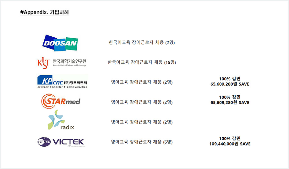 거기다 기업에서 임직원들에게 제공하는 교육 콘텐츠 아주 중요하잖아요. 그래서 케이드 직접 고용 프로그램을 통해 비대면으로 일대일 언어 교육을 제공하는 강사를 채용해 보시면 임직원 대상 비대면 어학 교육 서비스를 제공하는 것뿐만 아니라 장애인 직접 채용 혜택까지 받으실 수 있습니다.