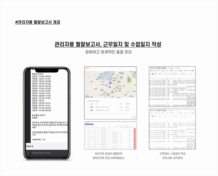 관리자용 원말보고서와 근무일지, 수업일지의 작성을 통해 정확하면서도 체계적으로 출결을 관리하고 있기 때문에 누수되는 부분 없이 염려하지 않고 교육을 받으실 수 있습니다.