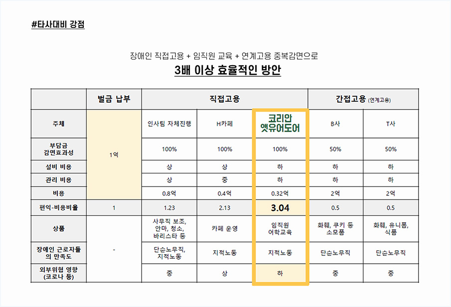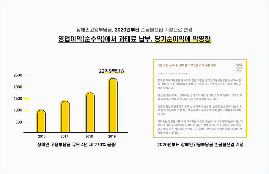 안녕하세요, 우리나라에는 장애인의무고용이라는 제도가 있죠. 2020년만 하더라도 장애인을 한 명도 고용하지 않은 경우 매달 179만원 정도의 부담금을, 올해는 최저임금에 맞추어 매달 182만원 정도의 부담금을 부과하고 있습니다. 장애인의무고용 부담금이 당기순이익에 악영향을 미치게 된 만큼 기업에서 이 부분에 대한 대안을 모색할 수 밖에 없는데요.