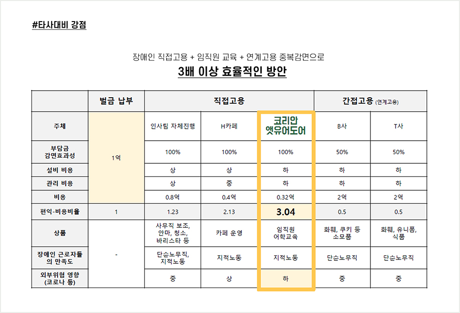 공부를 통하여 장애인의무고용제도를 이용해 지출을 줄일 수 있습니다. 그런데 전문적인 업체를 통하여 간접적인 고용이 좋은 이유는 고용을 하기 위한 각종 기회비용을 포함하여 직원 교육비도 함께 아낄 수 있기 때문입니다.