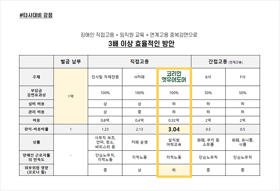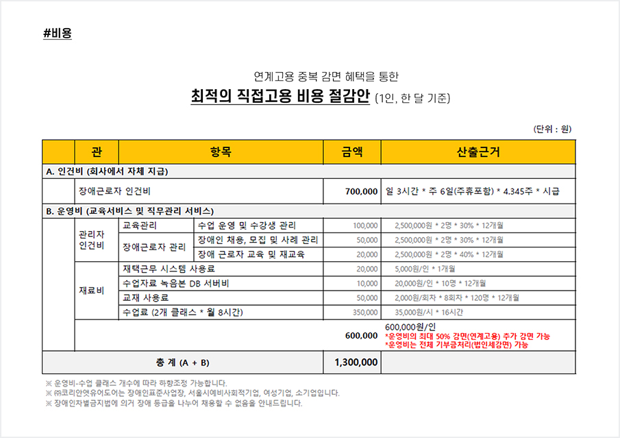 위 표를 보시고 어떤부분에서 절감이 되고있는지 살펴보시기 바랍니다. 장애인 직접고용과 연계고용 중복감면 그리고 임직원교육까지 몇배이상의 효율적인 방안을 제시해드리고 있습니다.