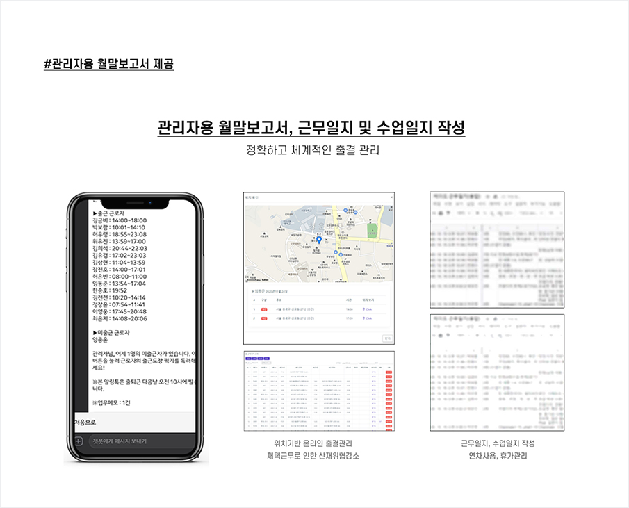 정확하면서 체계적인 출결관리를 통해 근태를 확인할 수 있으며 출근을 한 근로자의 시간도 입력되며 미출근한 근로자마저 체크가 가능합니다.