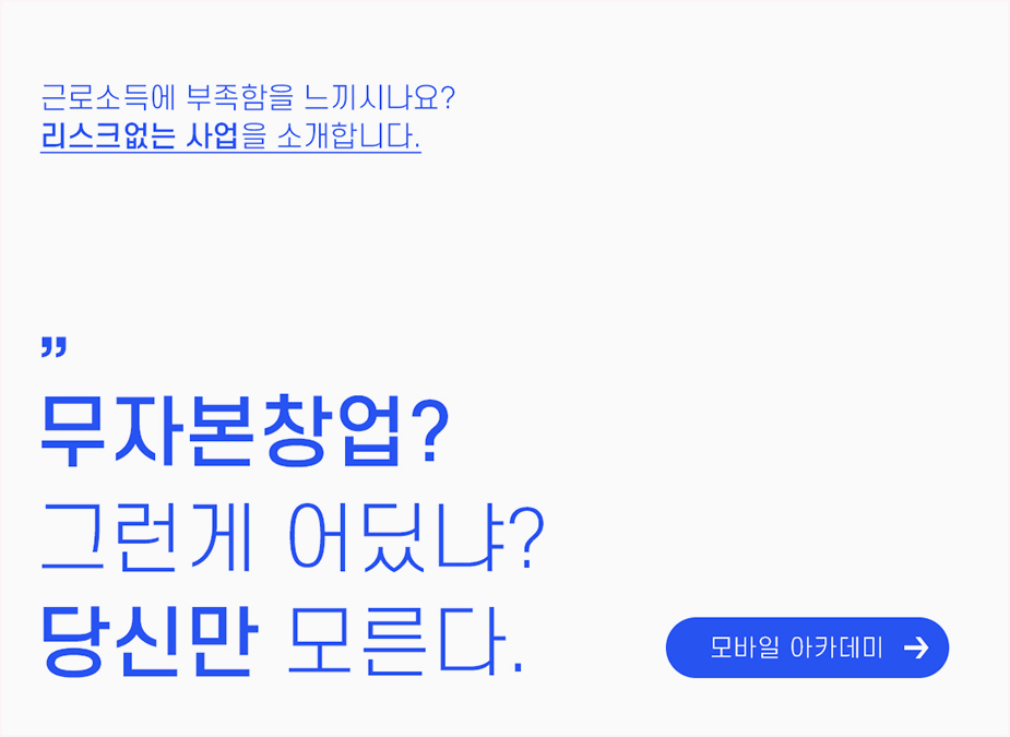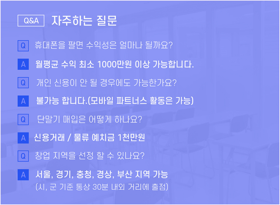 휴대폰 할인매장을 열 때 무자본으로 시작할 수 있는 곳이 과연 있을까? 라고 생각합니다. 하지만 제대로 알아본 사람들은 알고 있습니다. 무자본으로 충분히 시작할 수 있다는 것을 말입니다. 창업은 하고 싶으나 자금이 없을 때, 코로나 영향은 물론 기타 영향을 받지 않는 아이템을 시작하고 싶을 때, 오프라인&온라인 창업 모두 희망할 때 등 다양한 선택지에 놓인 분들에게 적합한 창업입니다.