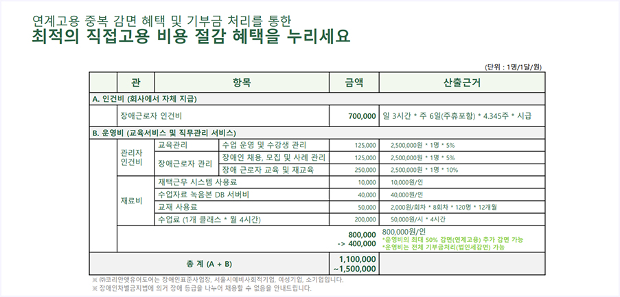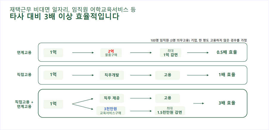 연계고용(교육서비스구매)와 직접고용(직무 제공)을 동시에 할 수 있기 때문에 타사와 다르게 3배 이상 효율적입니다.