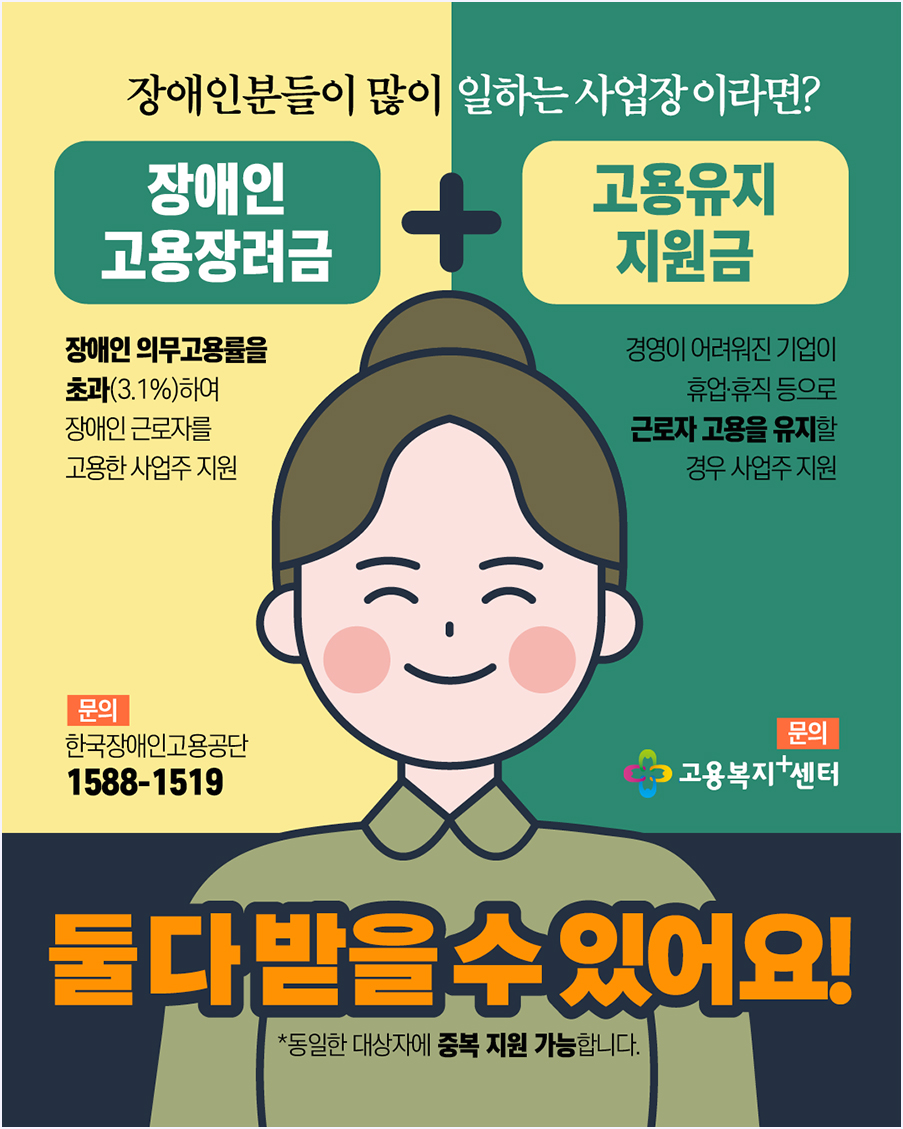 기업에서도 생산성이 떨어진다는 이유로 장애인일자리 창출에 대해 소극적인 모습을 많이 보이고 있습니다. 장애인고용부담금으로 인해 비용적으로 손해가 있음에도 불구하고요. 기업의 ***장애인일자리 창출에 대한 대한 부담을 경감시킬 수 있도록 장애인분들이 일하는 사업장은 고용을 유지할 수 있도록 지원해주는 금액과 장애인의 고용장려금 모두를 지원받는 것이 가능하며, 장애인분들은 일자리를 찾을 수 있습니다.