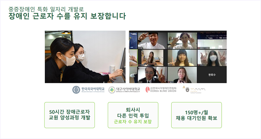 장애인비대면 사내어학강사 프로그램을 진행하는 비대면바우처플랫폼입니다. 장애인 분들을 채용하고 직무교육까지 책임져주고 있습니다. 거동이 어려운 장애인근로자분들을 위해서 교육도 비대면으로 진행합니다.