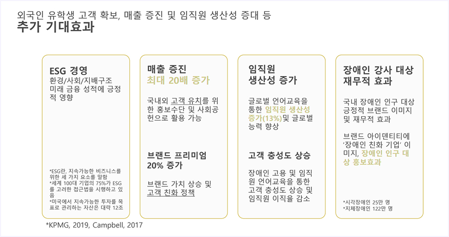사회적 기업과 함께 장애인일자리 창출에 참여하고, 직원들의 어학 능력을 위한 강의도 제공할 수 있으니 일석이조죠? 뿐만 아니라 케이드와 함께 함으로써 외국인 유학생 고객 확보, 매출증진 및 임직원 생산성 증대 등의 효과를 기대할 수 있습니다. 국내 장애인 인구를 대상으로 긍정적인 브랜드 이미지를 남기고 재무적 효과도 남길 수 있죠.