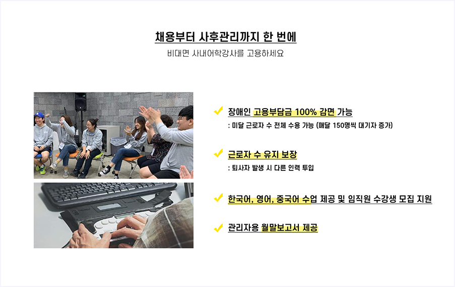케이드에서 장애인 어학강사 채용, 강사관리, 커리큘럼 관리, 사후관리까지 모두 해드리니 기업 입장에서는 부담이 적겠죠? 게다가 이를 통해 간접적으로 장애인 채용을 인정받을 수 있고, 비용이 줄어들 수 있죠. 장애인이 생산하는 서비스나 상품을 구매하는 것이 되기 때문에 장애인 고용부담비용의 절반의 감면이 가능합니다.