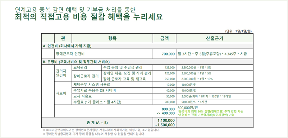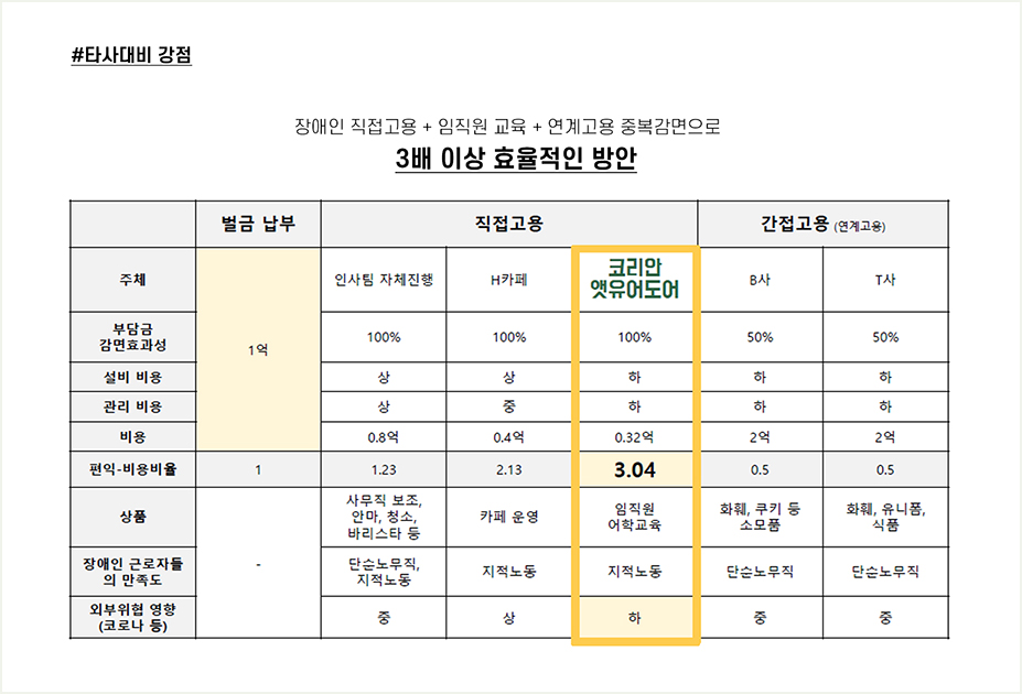 직접고용을 통해 비용절감 혜택도 누려보고 타사대비 효율이 거의 3배이상이라 볼 수 있는데요. 재택근무로 인해 비대면 일자리를 통해 장애인근무자도 좋고 기업입장에서는 시설비용이 들지않아 이득인거고, 임직원들 어학교육서비스까지