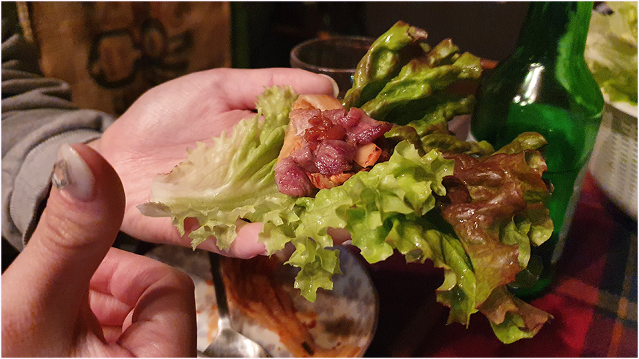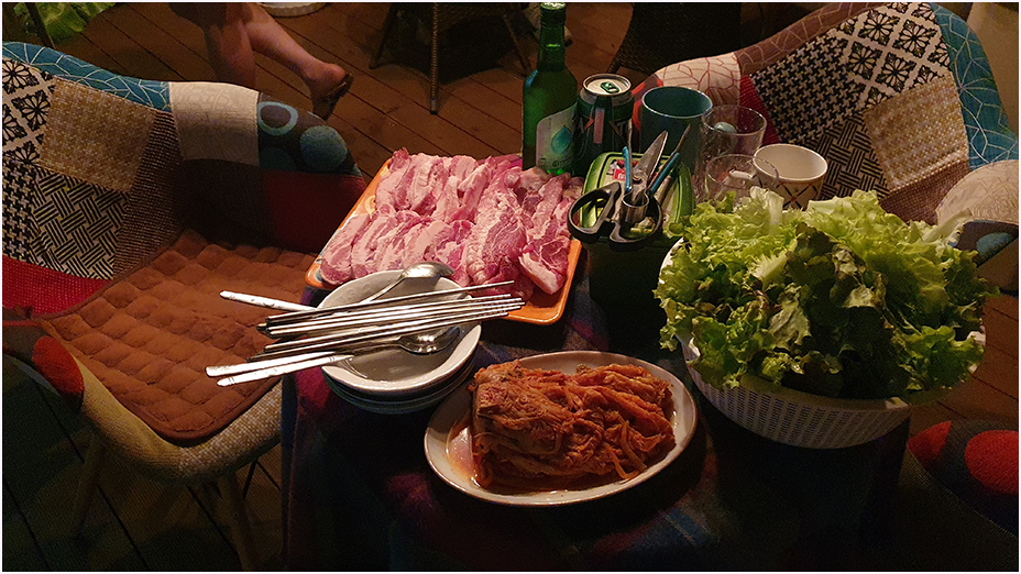 펜션에서는 또 고기를 구울 수 있는 공간을 제공해 주는데요, 오후에는 예약한 방, 팽나무카페 2층에서 쉬다가 저녁에는 삼겹살 구이 파티를 하였습니다. 참숯에 노릇하게 구운 삼겹살에 소주 한 잔을 곁들여서 먹으니 도심에 지친 몸과 마음이 힐링 되는 기분이였습니다.