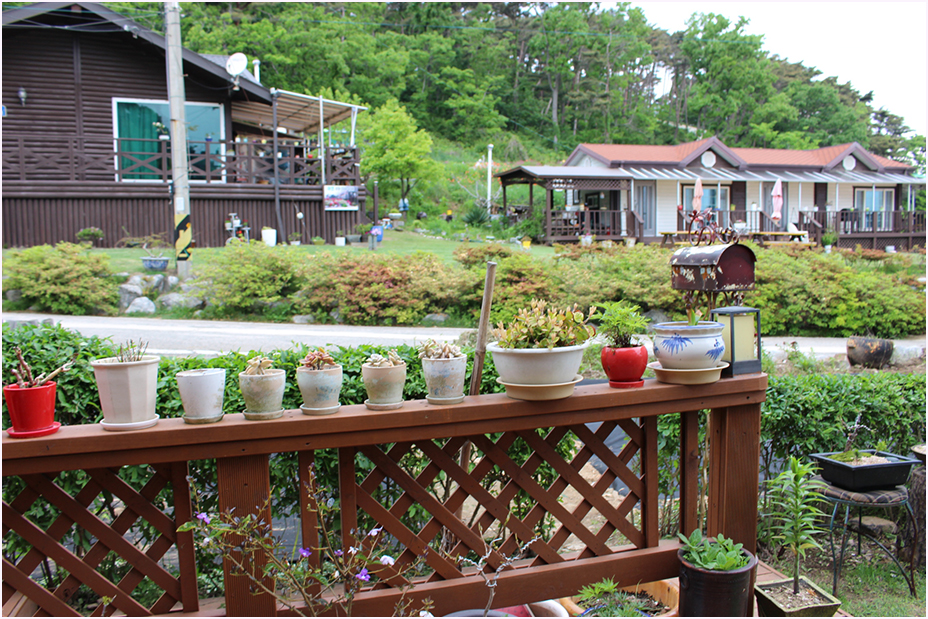도착하여 초보운전이지만 조심스레 가지고 간 레이 차를 타고 예약한 대이작도펜션 "팽나무집"에 찾아갔습니다. 10분 정도 차를 타고 작은 마을 두 곳을 지나니 색감이 진한 나무로 지어진 "팽나무집" 펜션이 눈앞에 모습을 보였습니다. 멀리서 바라보는 "팽나무집"은 주변의 산과 숲, 화단에 심어 놓은 꽃나무와 어우러져 매우 여유로워 보였습니다.