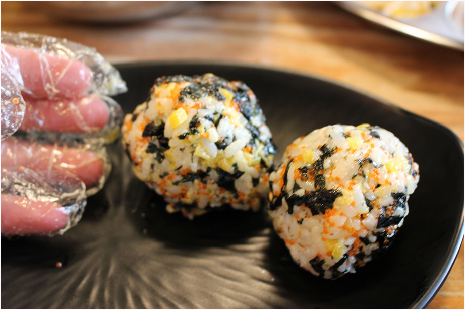 쭈꾸미에 절대 빠질 수 없는 주먹밥이 먼저 나왔습니다. 비닐장갑을 끼고, 만들어봤는데요. 사진 찍는다고 괜히 더 신경 써서 만들었답니다.