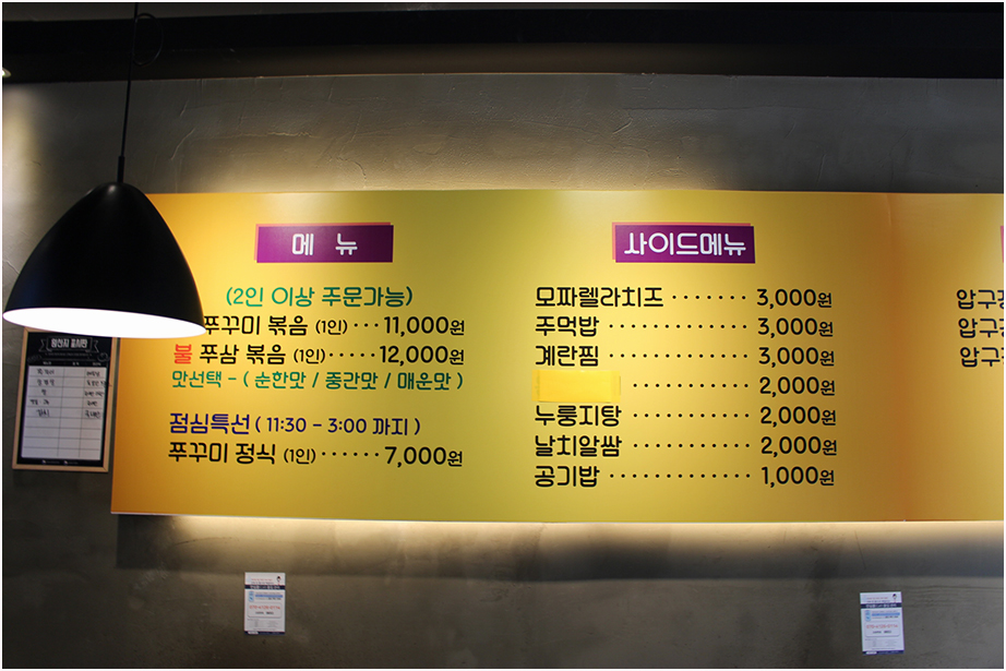 메뉴판을 보니까 쭈꾸미와 사이드 메뉴만 있더라고요. 괜히 더 기대되었던 것 같아요.