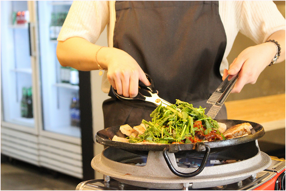 드디어 소래포구맛집의 메인 메뉴 중 저희가 시킨 쭈꾸미삼겹살이 나왔습니다. 직원분께서 잘 볶아주셨습니다. 냄새부터가 매콤하고 식욕이 돋더라고요.