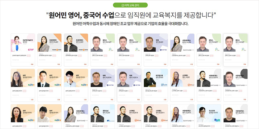 케이드에서는 실력 있는 한국어 영어 중국어 어학강사를 육성하는 프로그램으로 기업에 제공함으로써 직원이 직접 출근하는 형태가 아니라 시설투자에 대한 비용 부담에서 벗어날 수 있습니다.