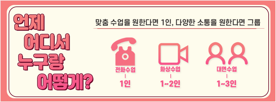 여의도어학원처럼 무조건 대면을 해야 하는 학습이 아닌 수업은 전화, 화상, 대면 온라인, 오프라인 형식으로 모두 가능하며 선호도에 따라 1대 1 수업, 스터디 그룹 수업 방식을 고르실 수도 있습니다.