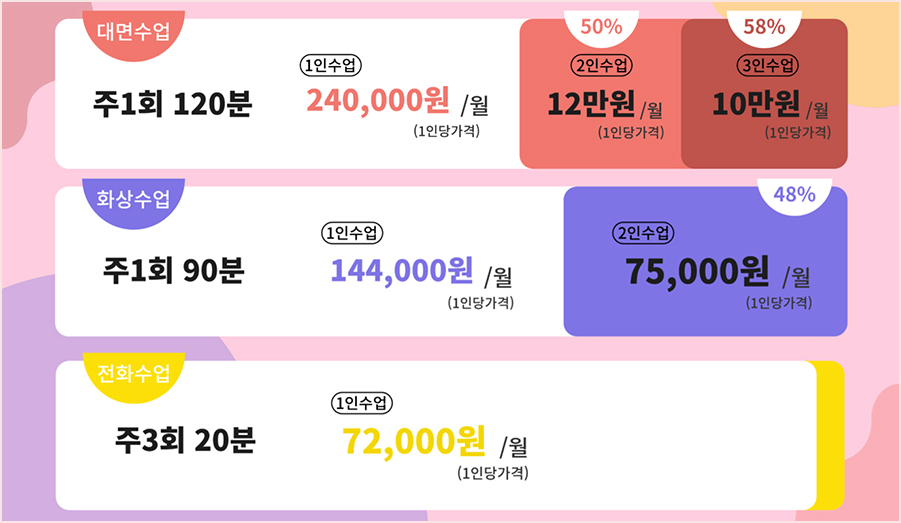 현재 대면수업과 화상수업, 전화수업이 마련되어 있으며 상황에 맞는 것으로 선택할 수 있습니다.