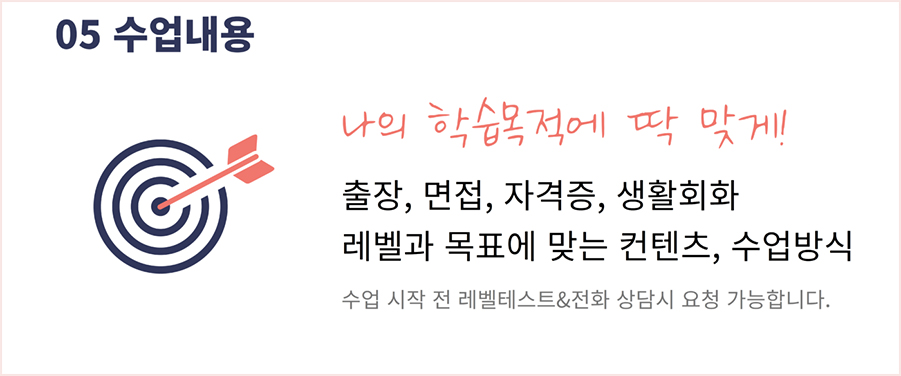 합리적인 가격을 책정하여 부담없이 이용하실 수 있고 문법 위주의 학습보다는 본인의 언어 능력을 키우고 싶어 하시는 분들을 위한 프로그램들이 다양하게 준비되어 있습니다.