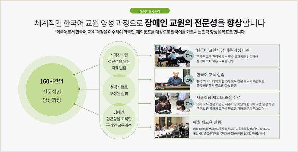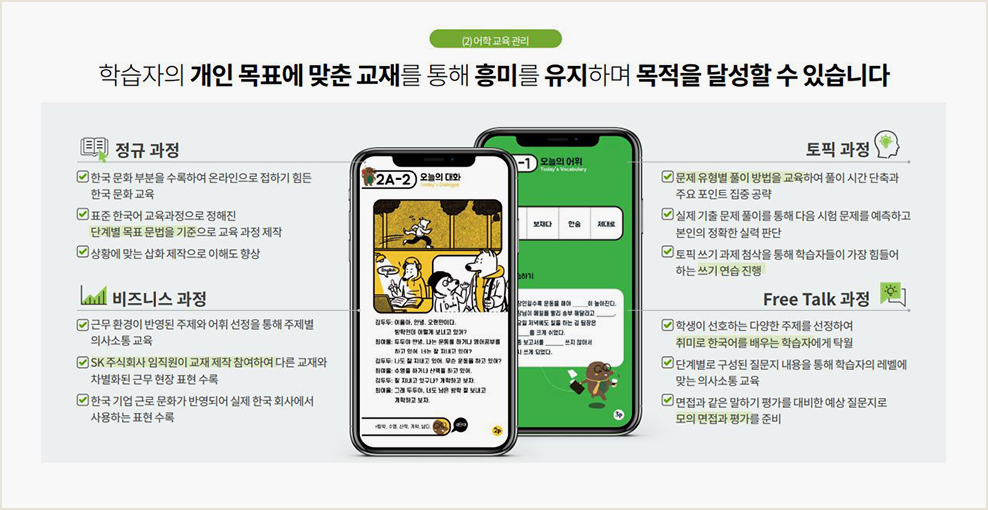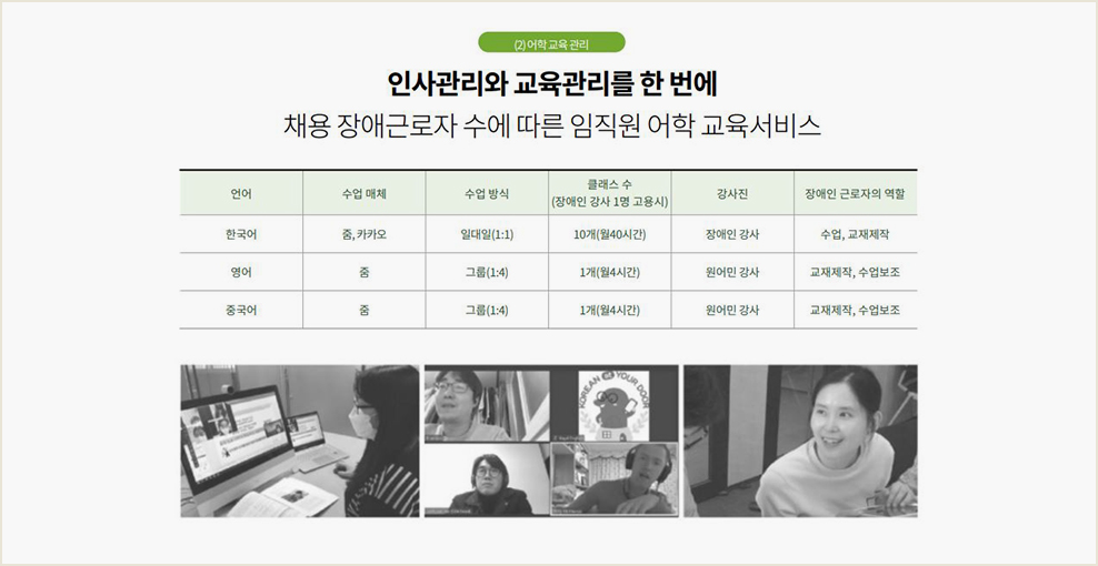 한국어, 영어, 중국어 과목 중에서 선택할 수 있고 1:1 교육, 그룹수업, 출강수업 등 기업의 선택에 따라 원하는 형태로 수업이 가능합니다.