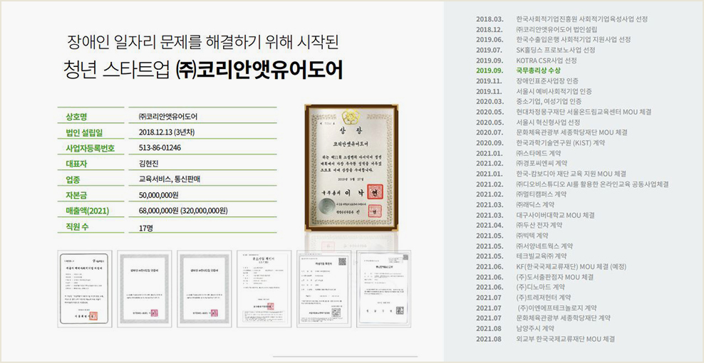 코리안 앳 유어 도어, 케이드에서는 장애인채용 문제를 해결하기 위한 스타트업으로 양질의 일자리를 창출하고 기업을 위해 실질적인 도움이 되어드리고 있습니다.