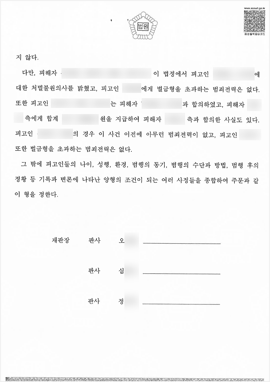 법정에서는 우발적인 쌍방 폭행인 상황이지만 재판부에서 서로 화해하는 모습, 젊은 의뢰인 분들과 친구들이 가정, 사회로 회귀하여 정상생활을 할 수 있도록 선처를 구하였습니다.