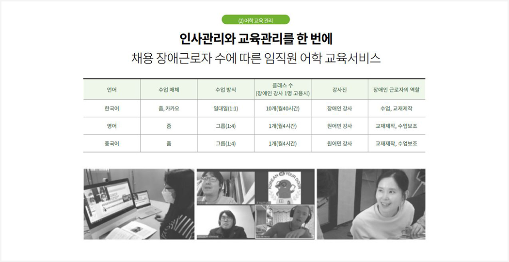 또한 전문적인 어학 강사한테 제대로 배울 수 있기 위해 50시간 장애 근로자 교원 양성과정을 개발하였으며, 개인적인 일이나 불가피하게 퇴사 시 다른 인력이 바로 투입될 수 있어 근로자 수를 유지할 수 있습니다.