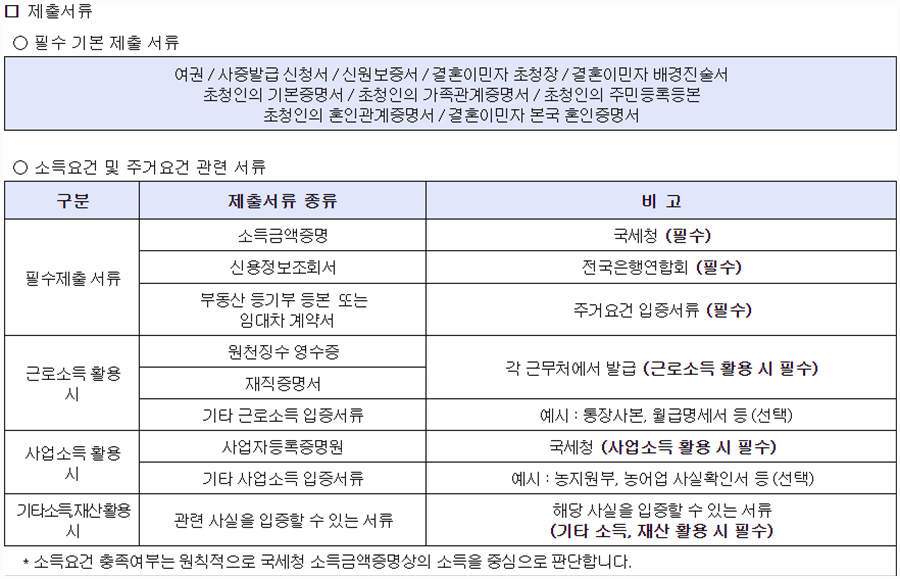 소득금액 증명서와 신용정보 조회서를 비롯해 근로소득이나 사업소득, 기타 소득 재산 활용에 따른 제출서류가 상이하고 그중에서도 topik 성적증명서와 교육기관에서 이수한 이수증, 한국어 학위증 등 한국어회화가 어느 정도 가능한지 살펴보고 있습니다.
