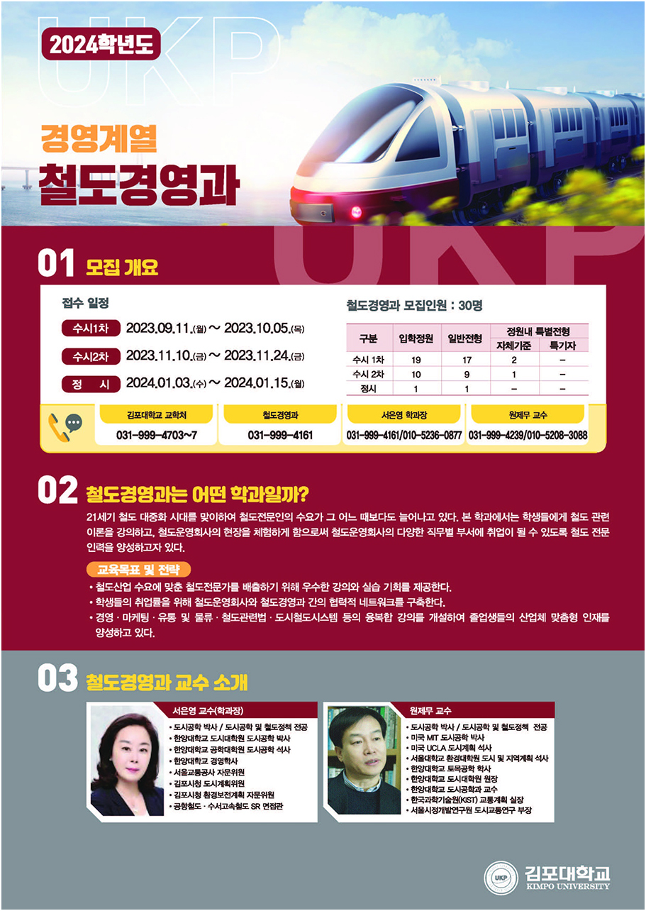 앞으로 수시 2차와 정시 일정이 남아있으니 자세한 일정은 포스터를 봐주시길 바라며 문의할 점이 있다면 철도경영과 학과장이신 서은영 교수님께 문의하시길 바랍니다.