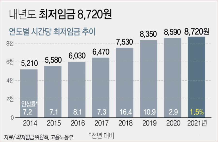 올해인 2020년의 최저임금은 8,590원으로 결정되었지만 내년인 2021최저임금결정은 8,720원의 금액이라고 합니다.