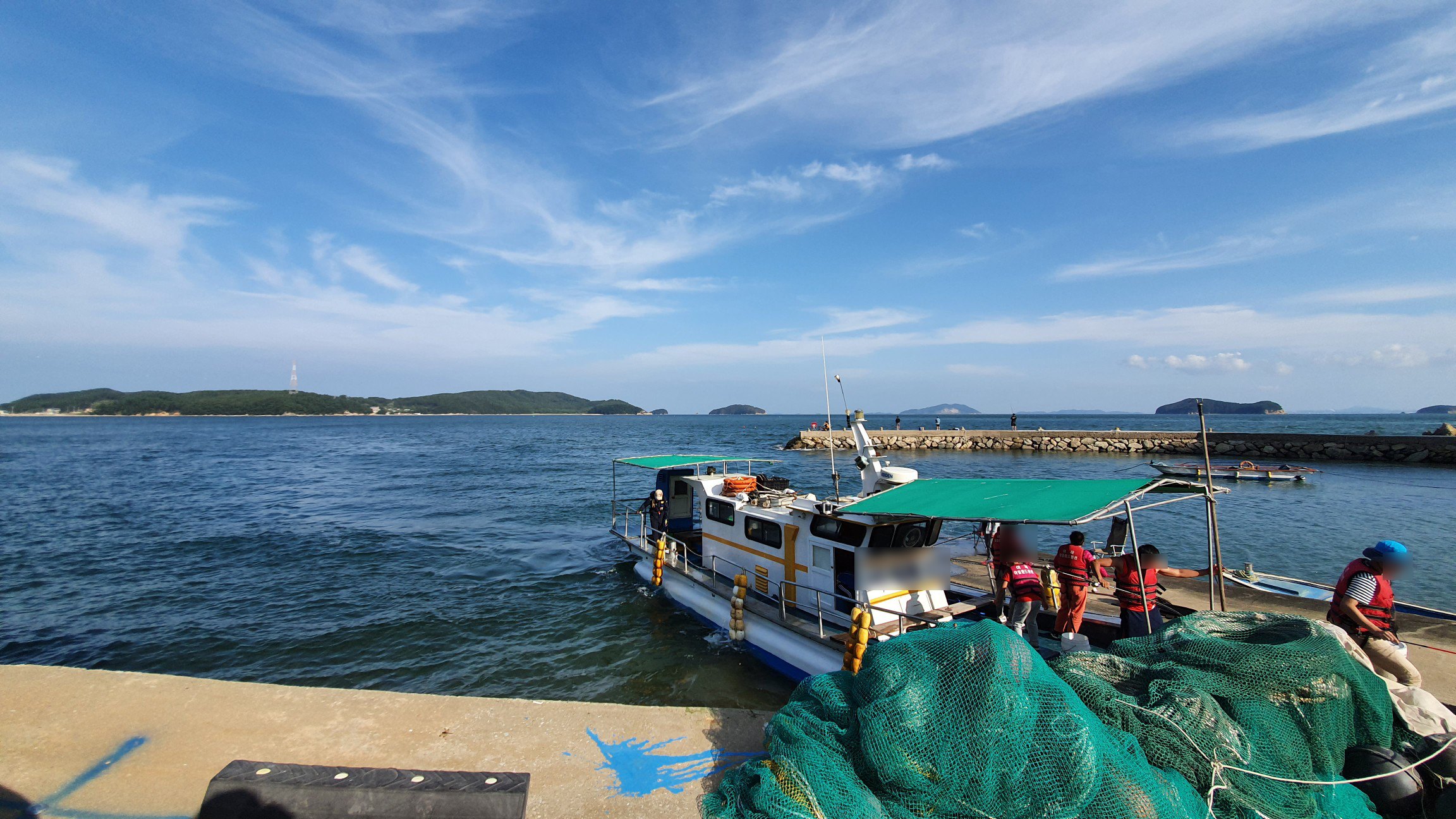 상당한 시간동안 여객선을 타고 안으로 들어와야 하는데 2시간 10분 정도 걸렸던 것 같고, 우리가 내려야 할 대이작도가 3번째 정류장이었는데 중간중간에 네다섯 군데 섬을 들르는 노선이기 때문에 방송을 잘 들어야 했음.