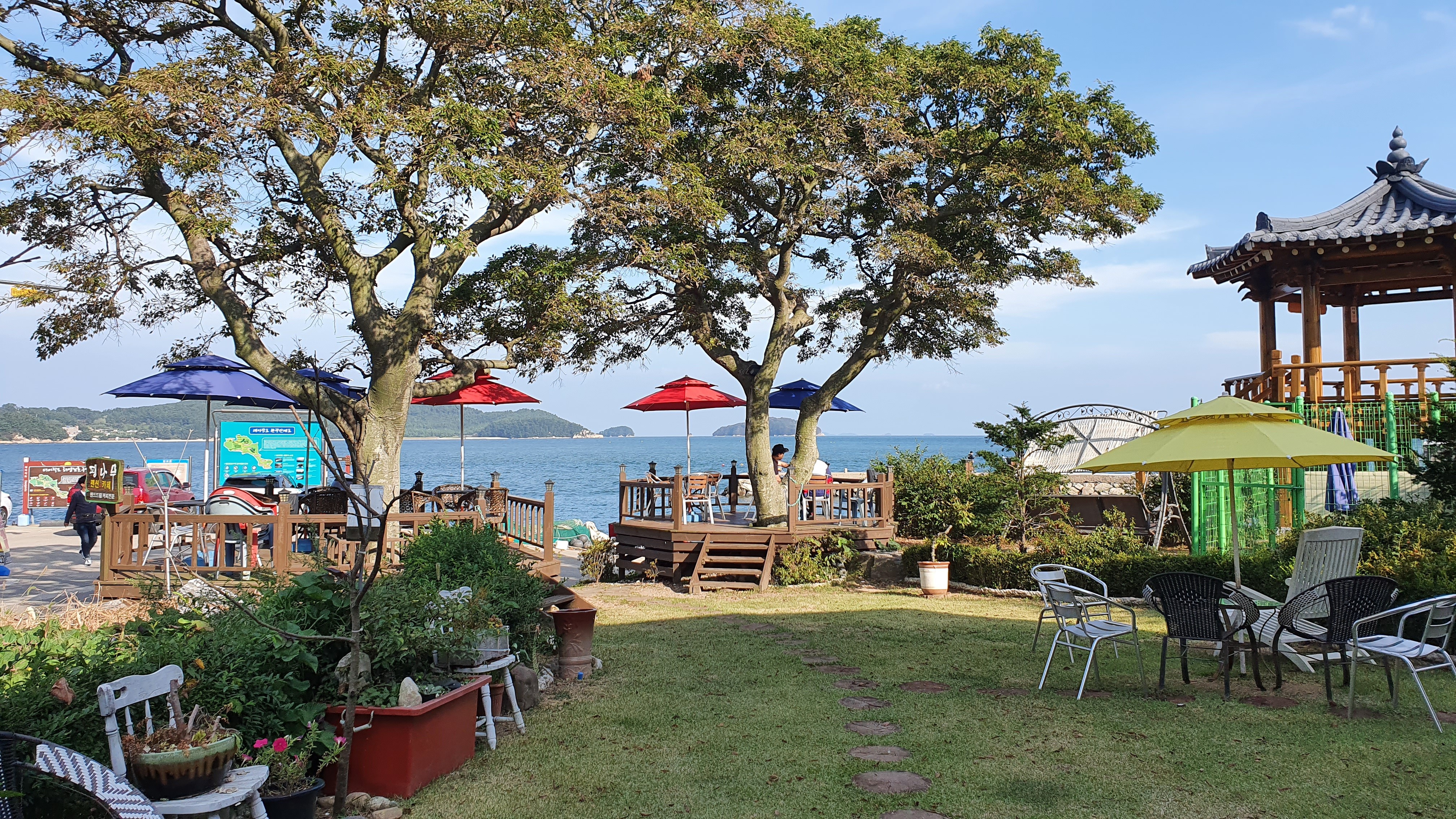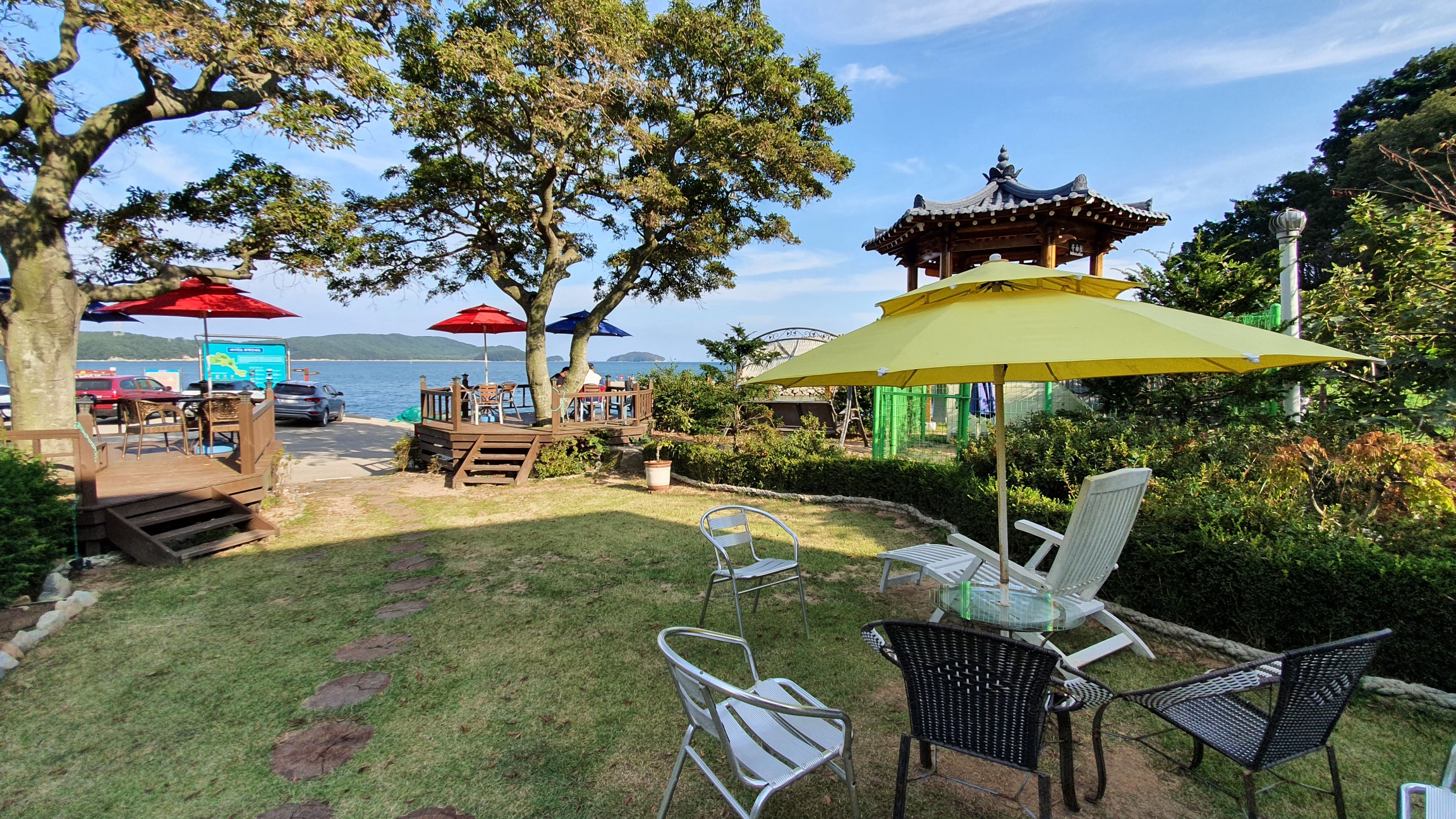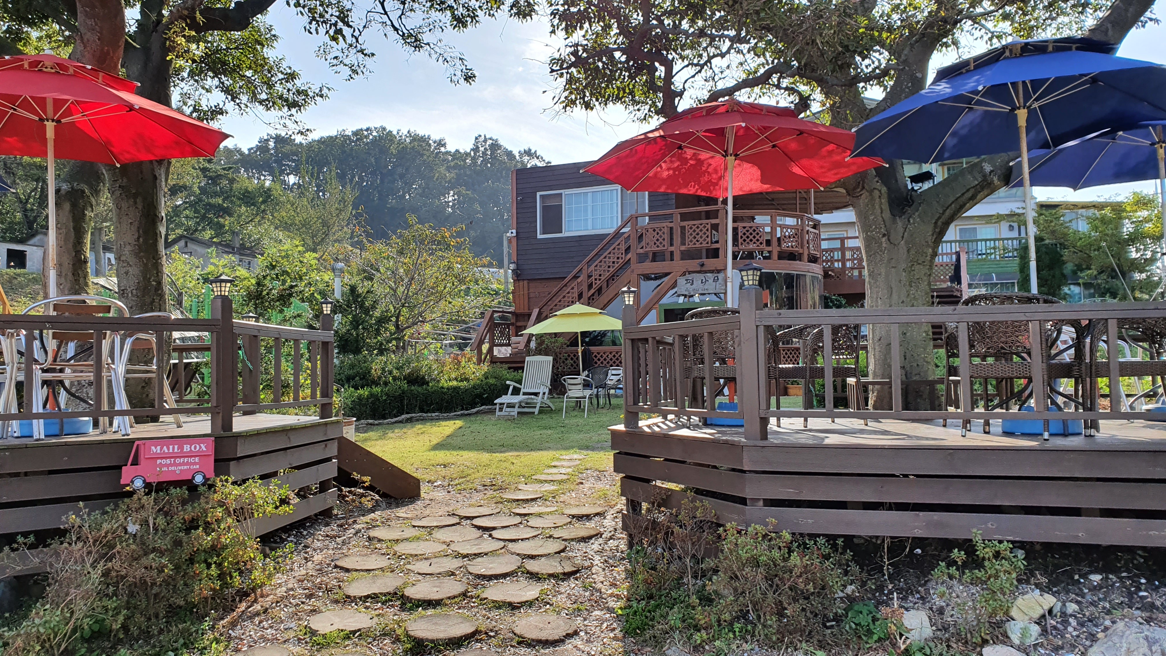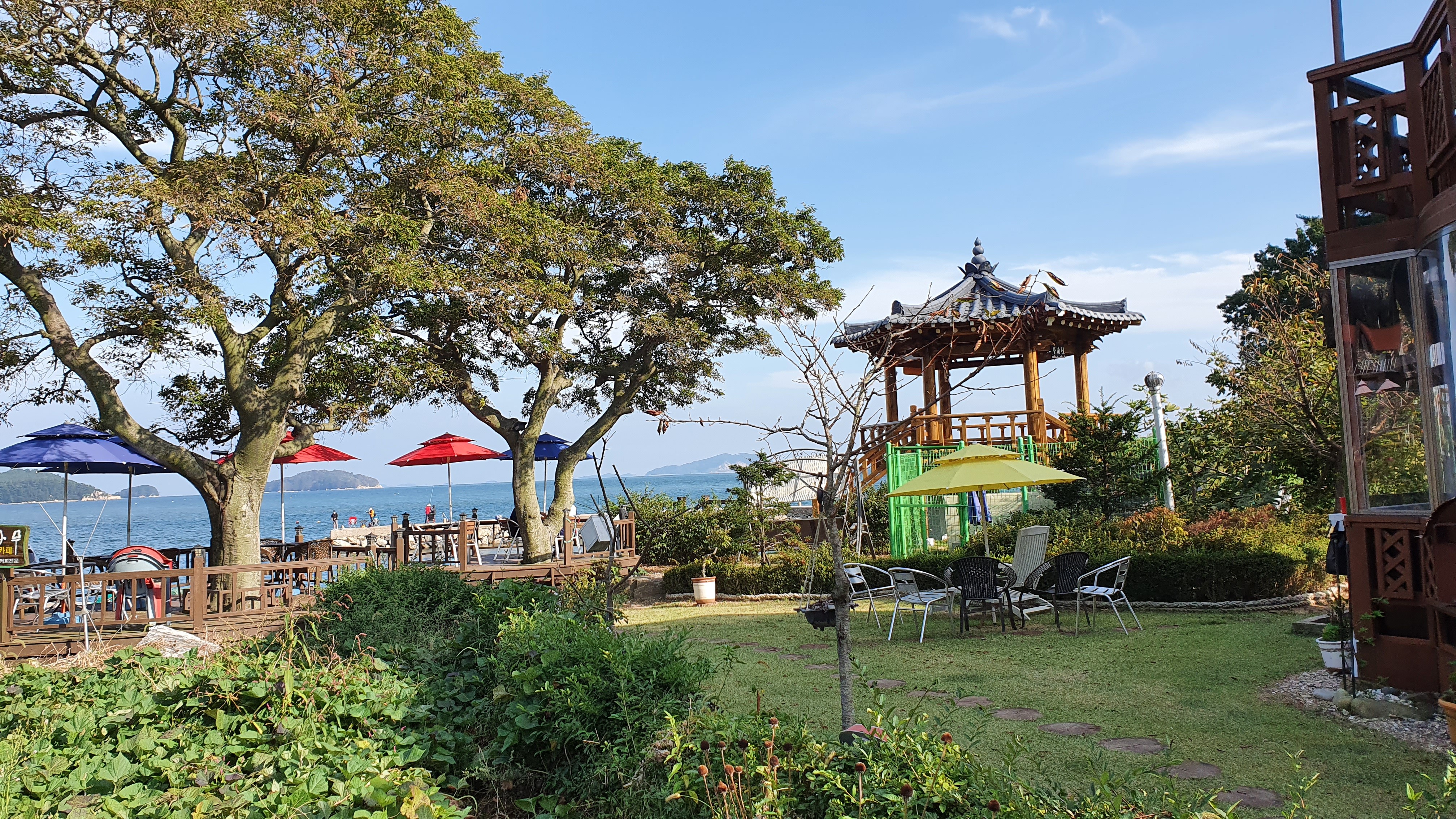 펜션 마당도 있고 파라솔 좌석도 있어서 바다 전망 보면서 커피 마실 수 있게 되어 있음.