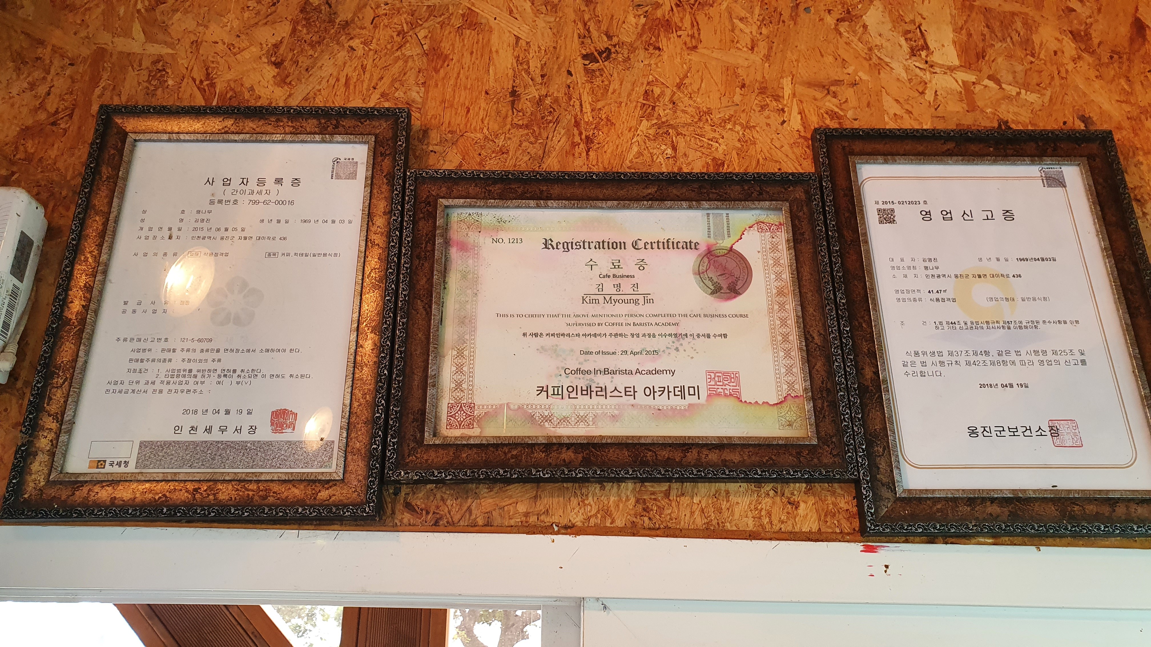 사장님께서 바리스타 자격증을 보유하시고 카페 내부에 잘 보이는 곳에 액자로 걸어두셨음.