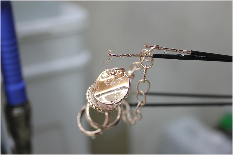 주물 공정이 완료되면 쥬얼리는 17년 이상의 경력을 보유하고 계신 18k목걸이 도금 장인의 손끝에서 새로운 색감으로 재탄생하게 됩니다. 커스티지의 쥬얼리들은 실제로 금이 첨가되는 고가의 도금과정을 거치고 있으며 이 과정을 통해 쥬얼리의 변색이 방지되고 좀 더 반짝이는 광택과 수분이 닿게 되었을 때 쥬얼리에 얼룩이 지는 것이 아닌 동그랗게 이슬이 맺히는 현상을 일으키기도 합니다.
